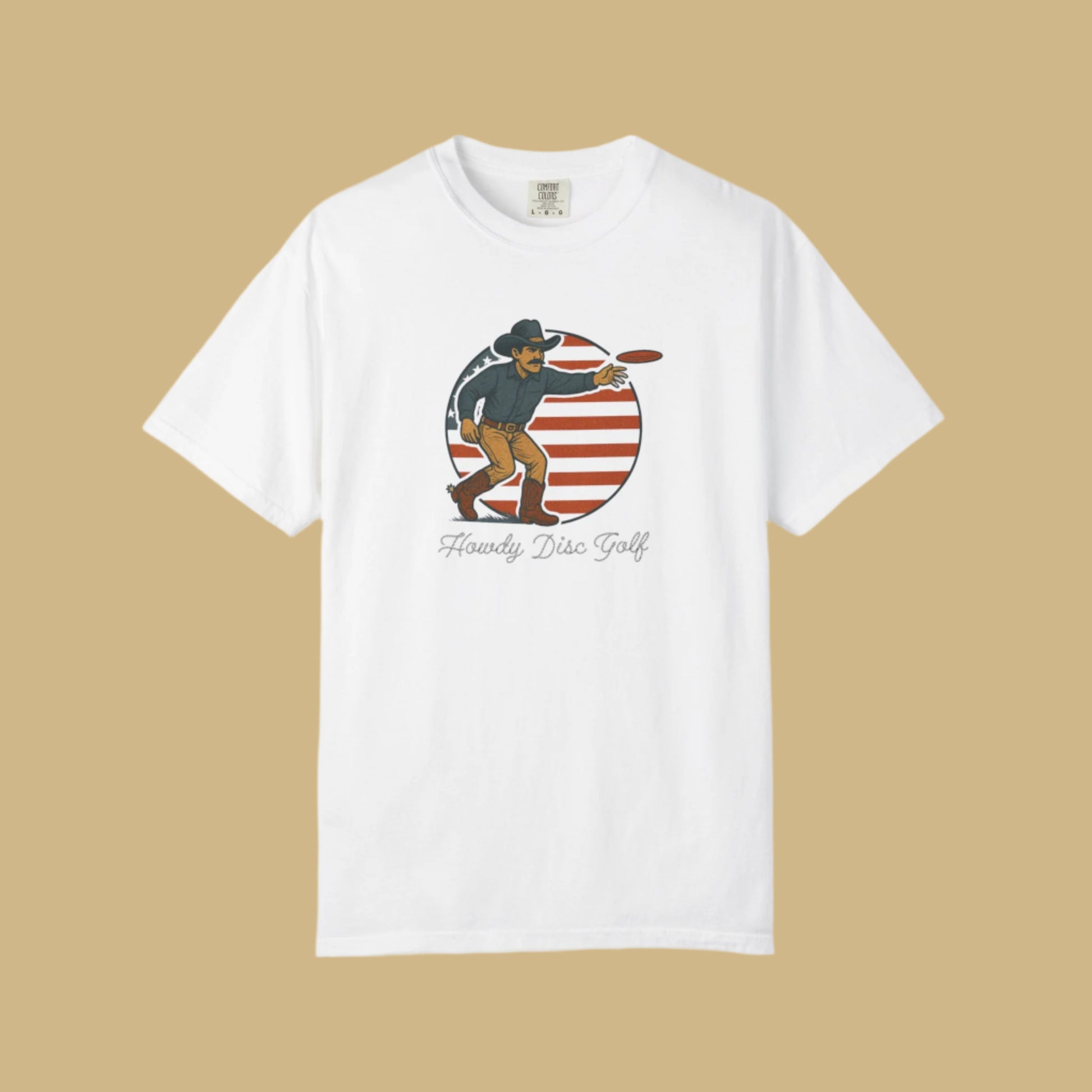 The American Cowboy Huck T-Shirt blends disc golf with red, white, and blue grit. Featuring a small chest logo up front and a bold cowboy throwing heat in front of the American flag on the back, this shirt honors freedom, flight, and fairways. It is perfect for disc golfers who ride for freedom and is great for Memorial Day, 4th of July, or a casual Sunday round. The relaxed fit and sturdy feel make it comfortable for both casual and semi-formal settings.