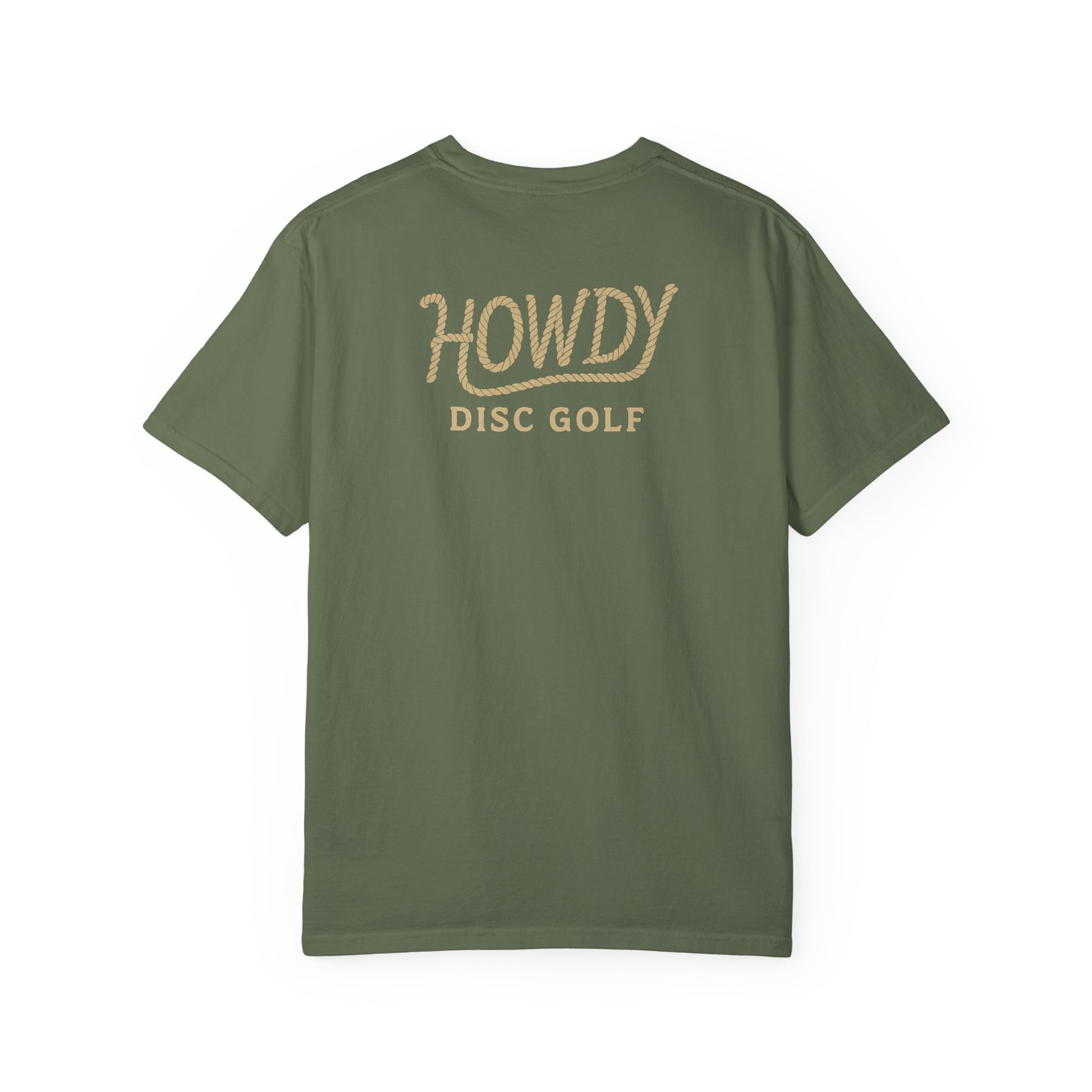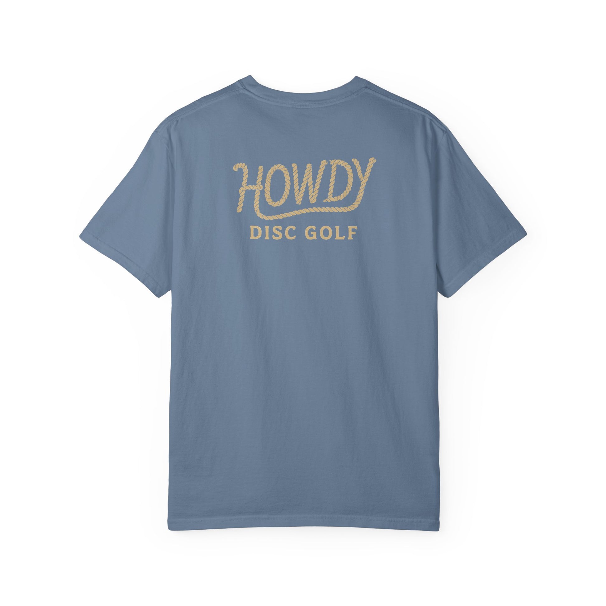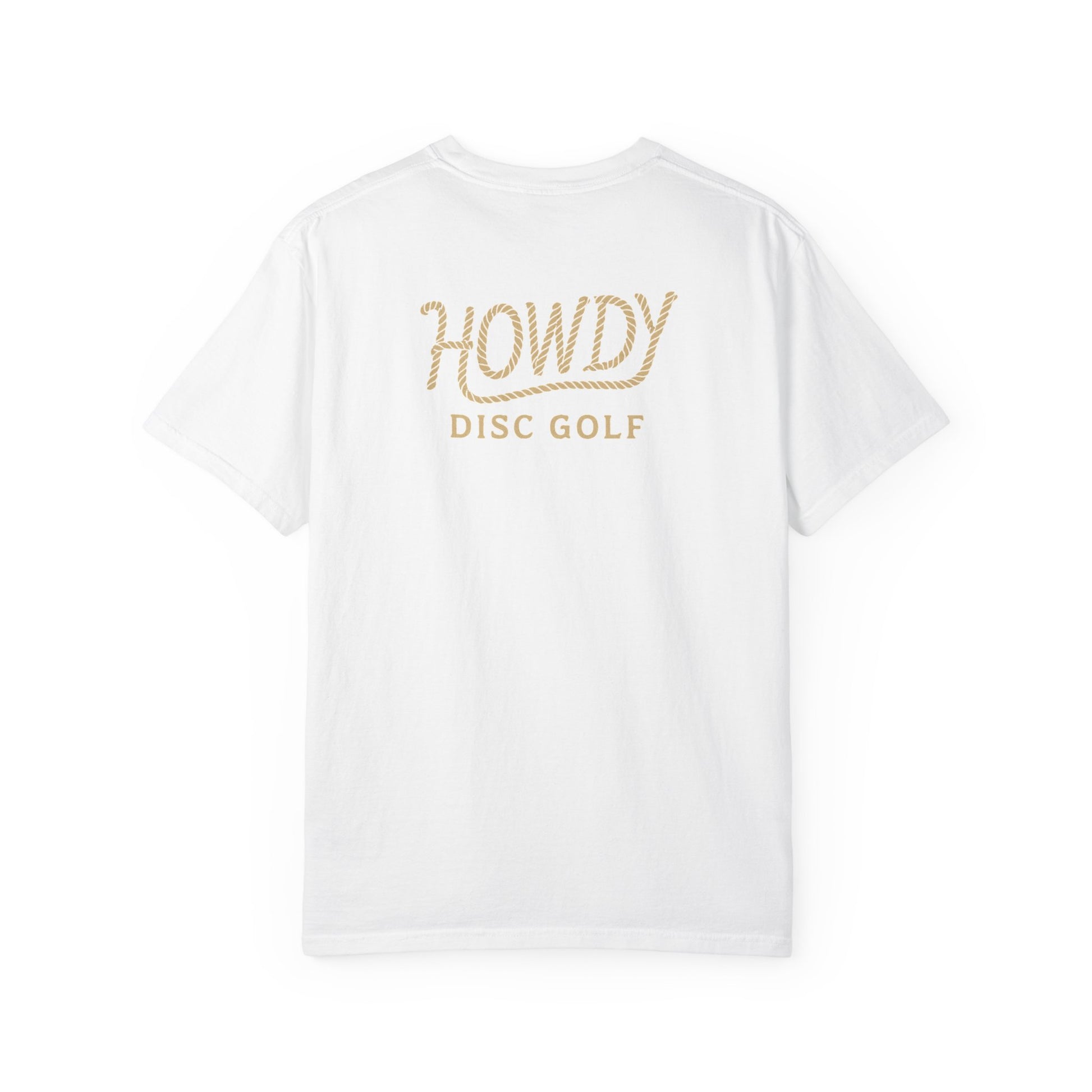 The Howdy Bronco Tee is for the disc golfer who plays with western fire and frontier flair. With a bold bucking bronco graphic across the chest and a signature rope logo on the back, this tee brings Texas toughness and vintage attitude to every throw. Made for comfort, washed for a worn-in feel, and ready to ride from tee pad to town, this shirt delivers clean design with a wild streak. Perfect for those who love disc golf and cowboy style.