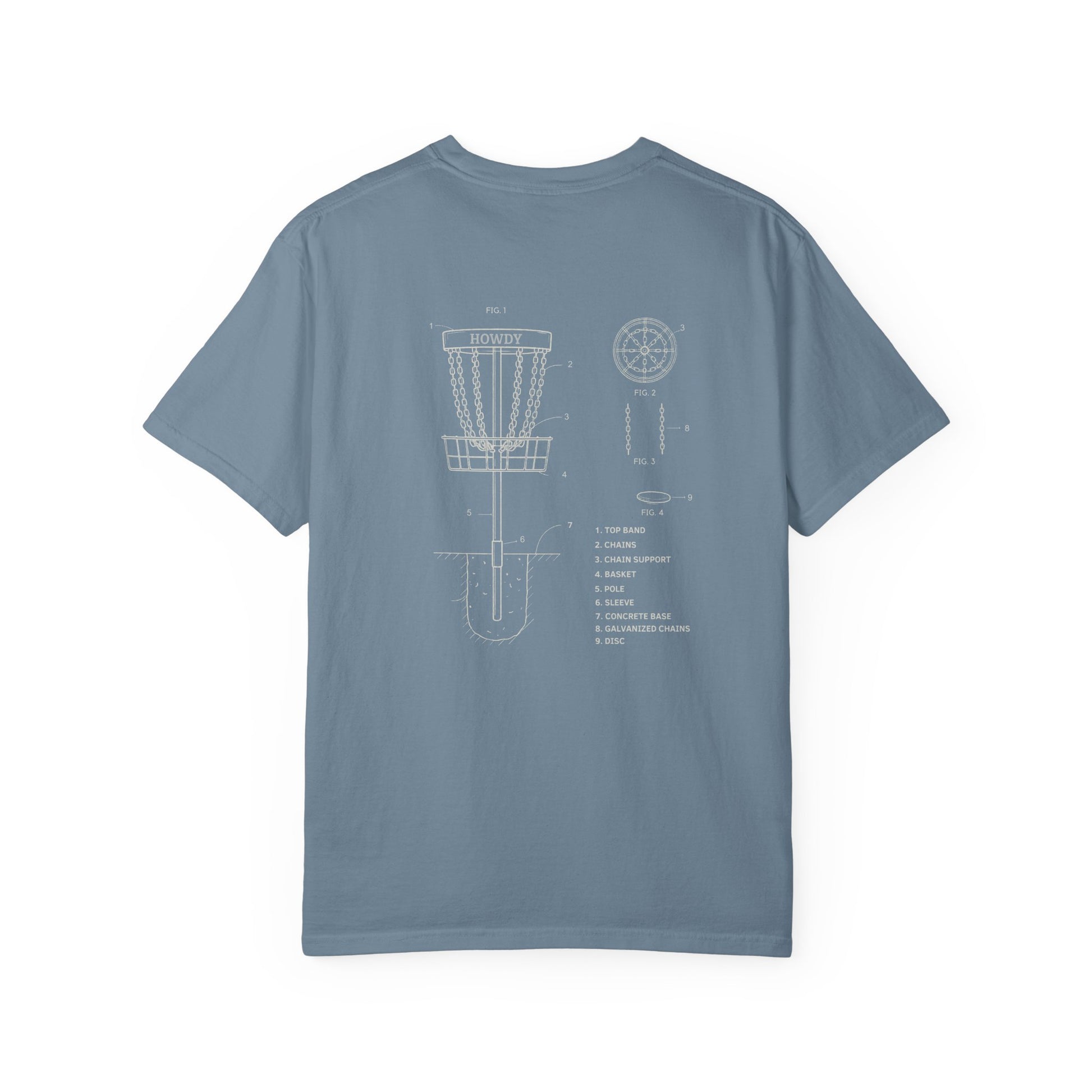 A comfortable and stylish blue t-shirt featuring a disc golf basket print with the word 'howdy' on the band. Perfect for disc golf enthusiasts looking for a casual yet fun addition to their wardrobe. Ideal for wearing during outdoor activities or casual hangouts with friends.