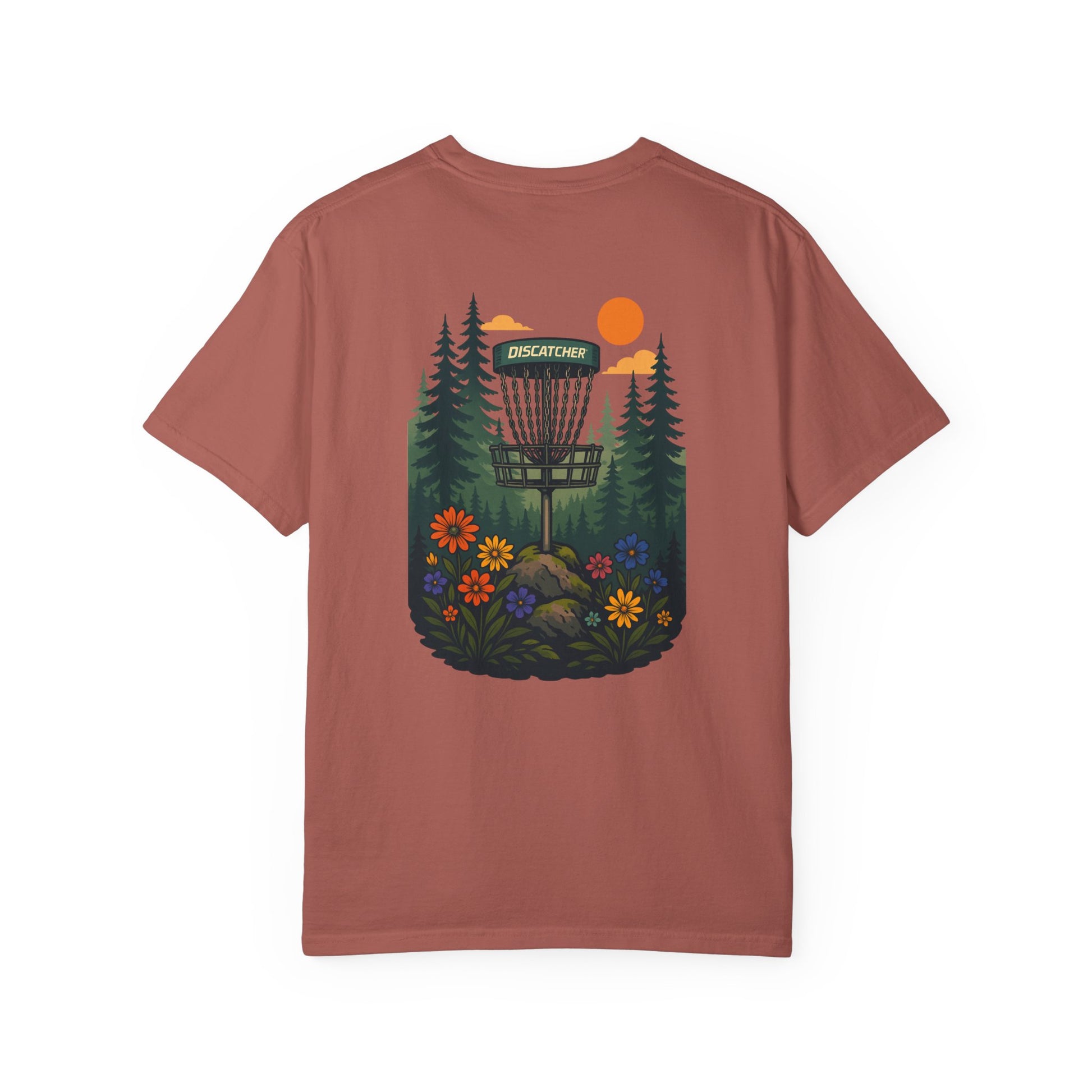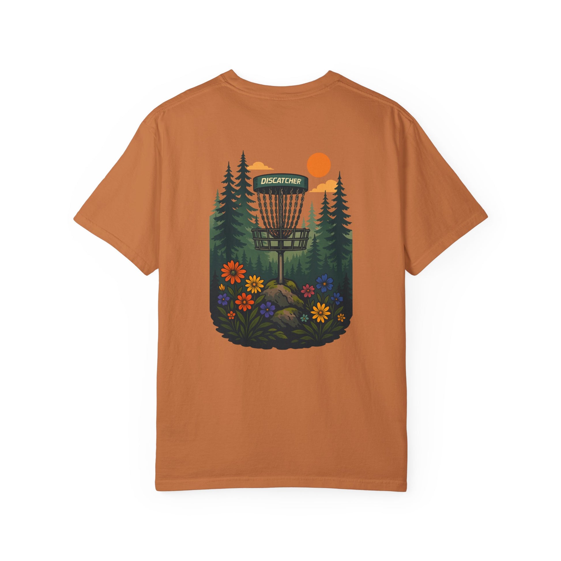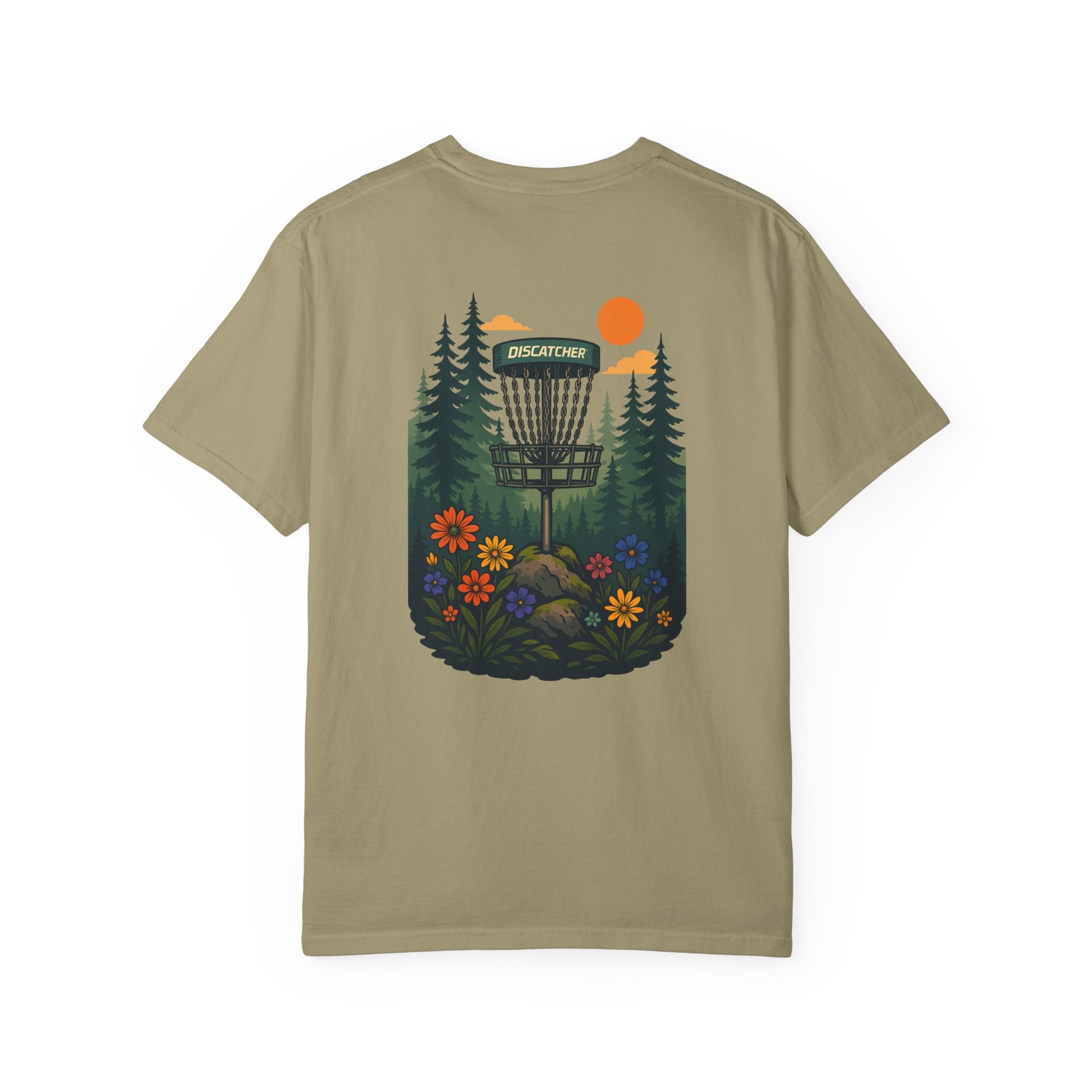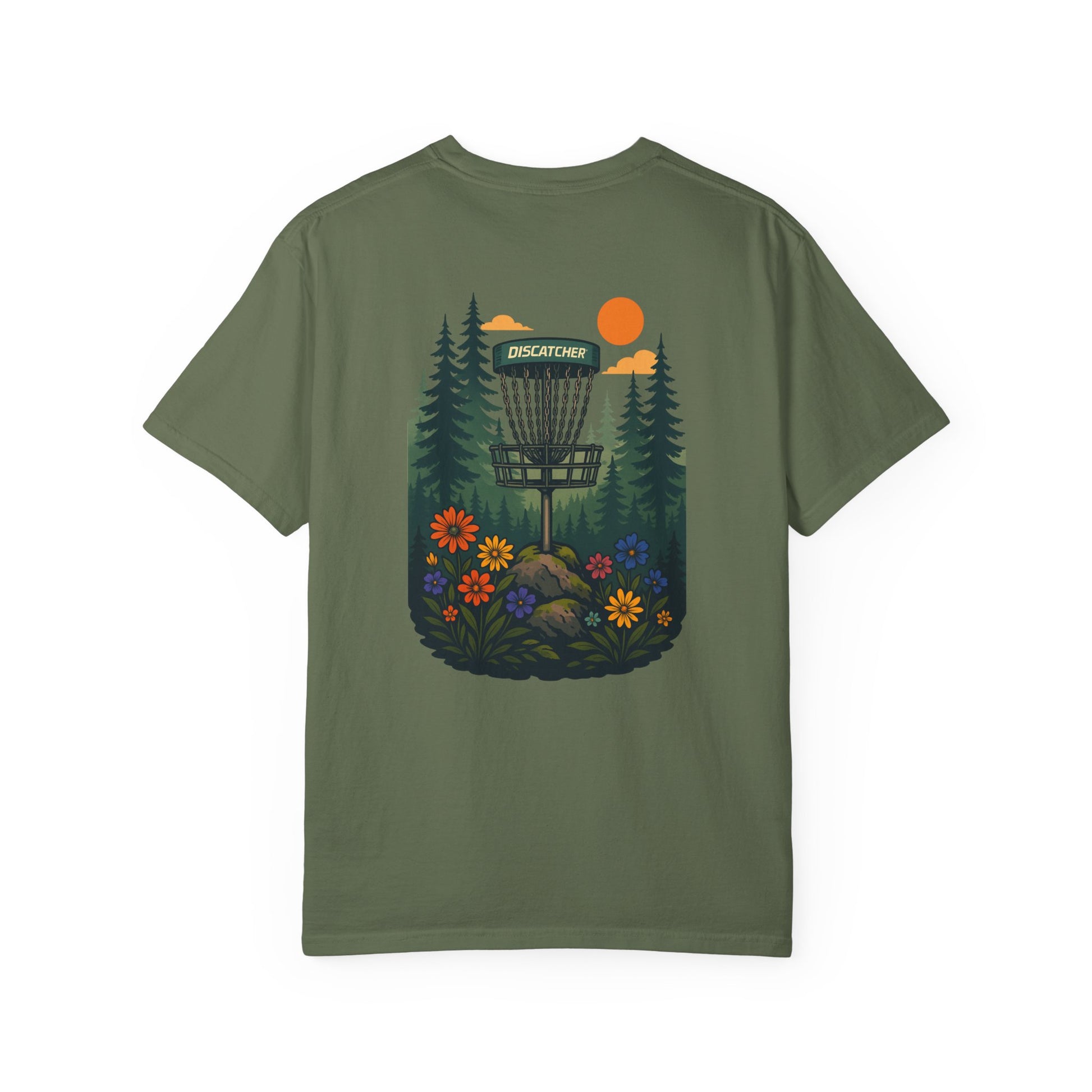This disc golf-themed T-shirt featuring a disc basket with pine tree and flowers around it is perfect for disc golf enthusiasts. It gives off a casual and outdoorsy vibe, making it ideal for everyday wear or a day out on the disc golf course. This Unisex Garment-Dyed T-shirt is relevant for disc golf players, nature lovers, and outdoor enthusiasts. It's great for casual wear, disc golf tournaments, outdoor adventures, or as a gift for disc golf enthusiasts.