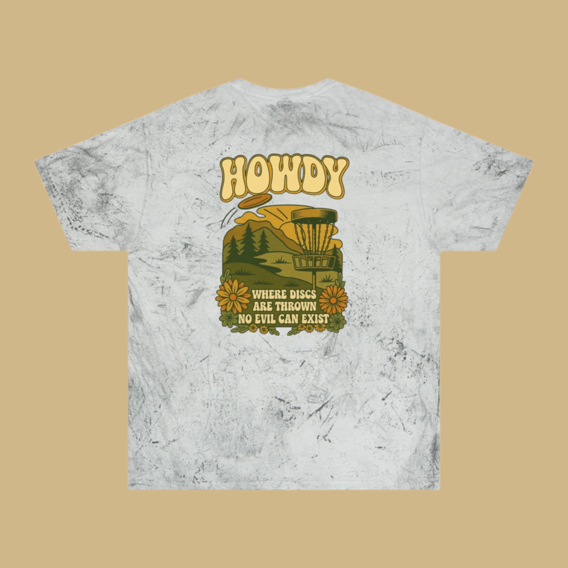 T-Shirt Howdy Disc Golf Tee 'Where Discs Are Thrown, No Evil Can Exist' Tie-Dye Design