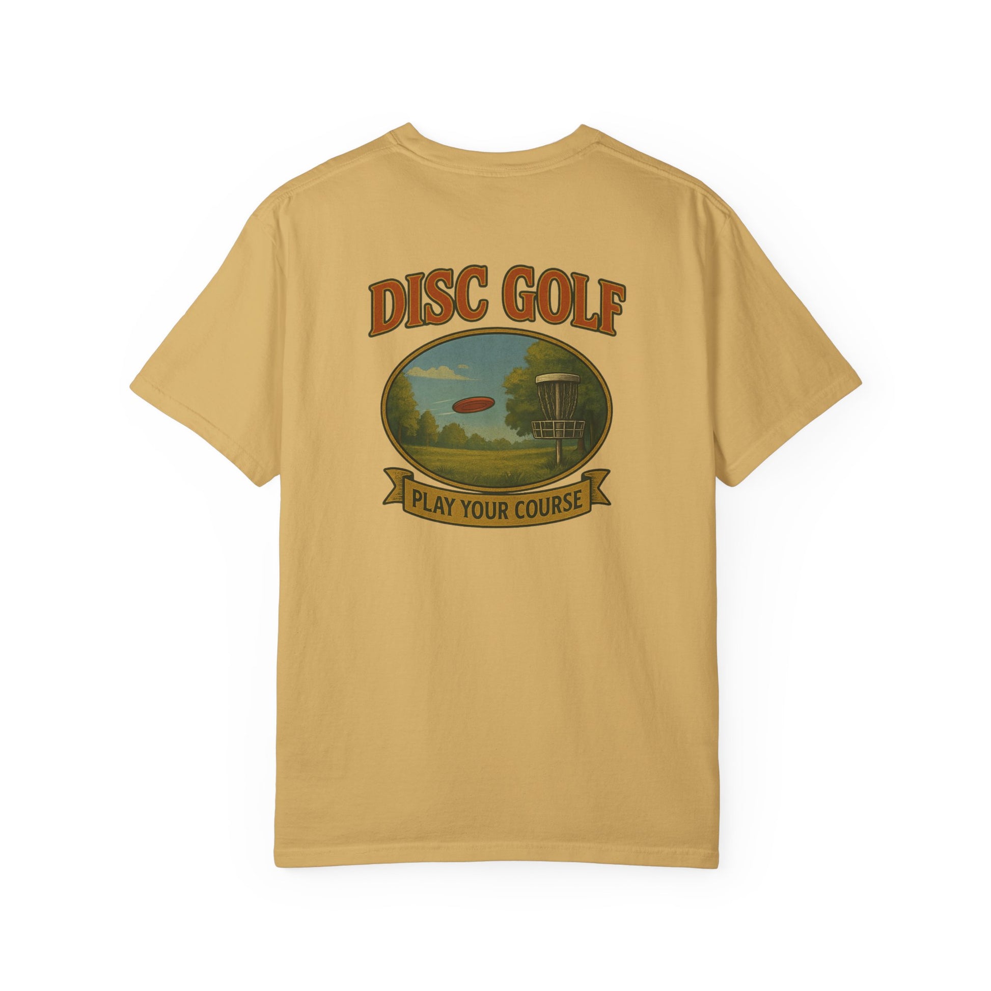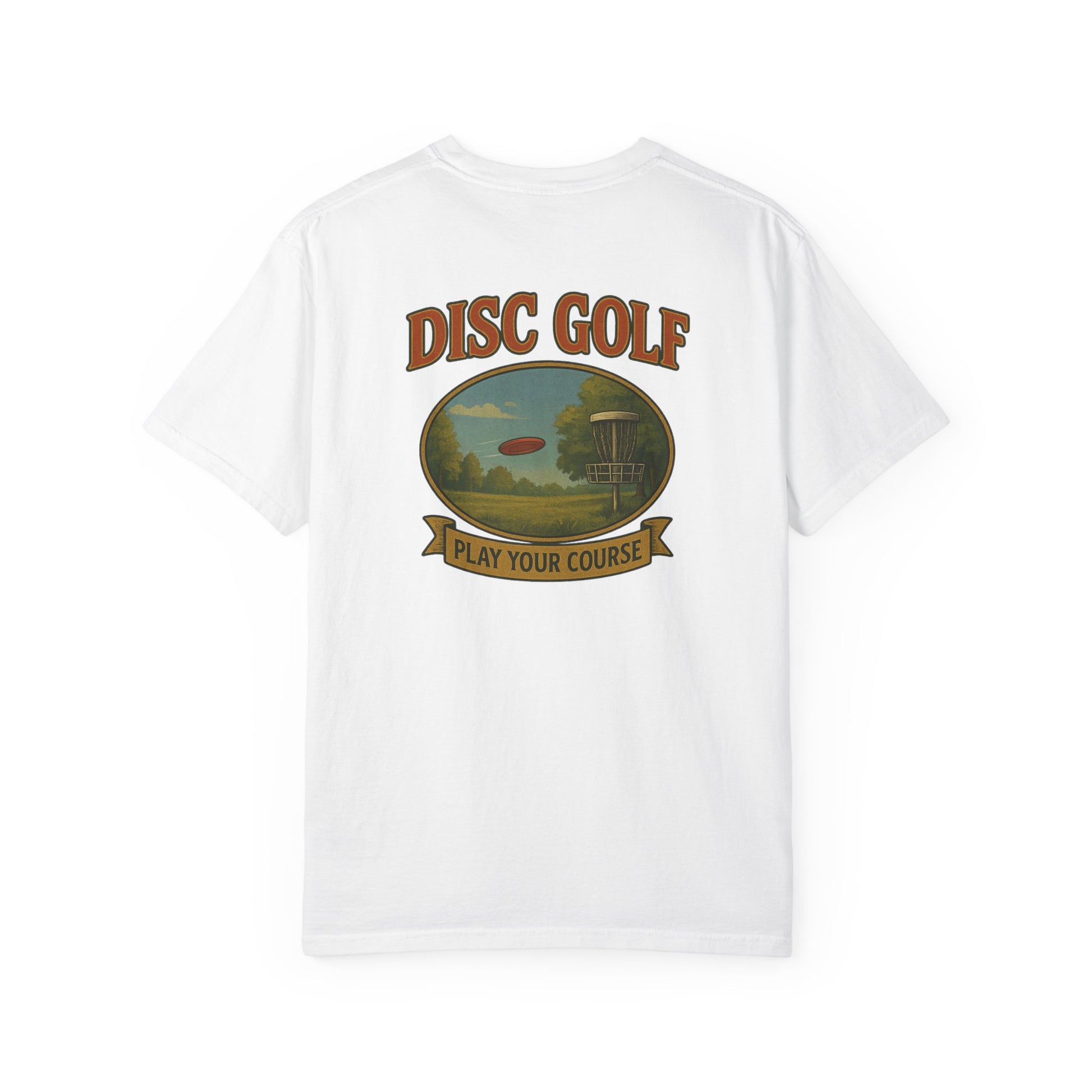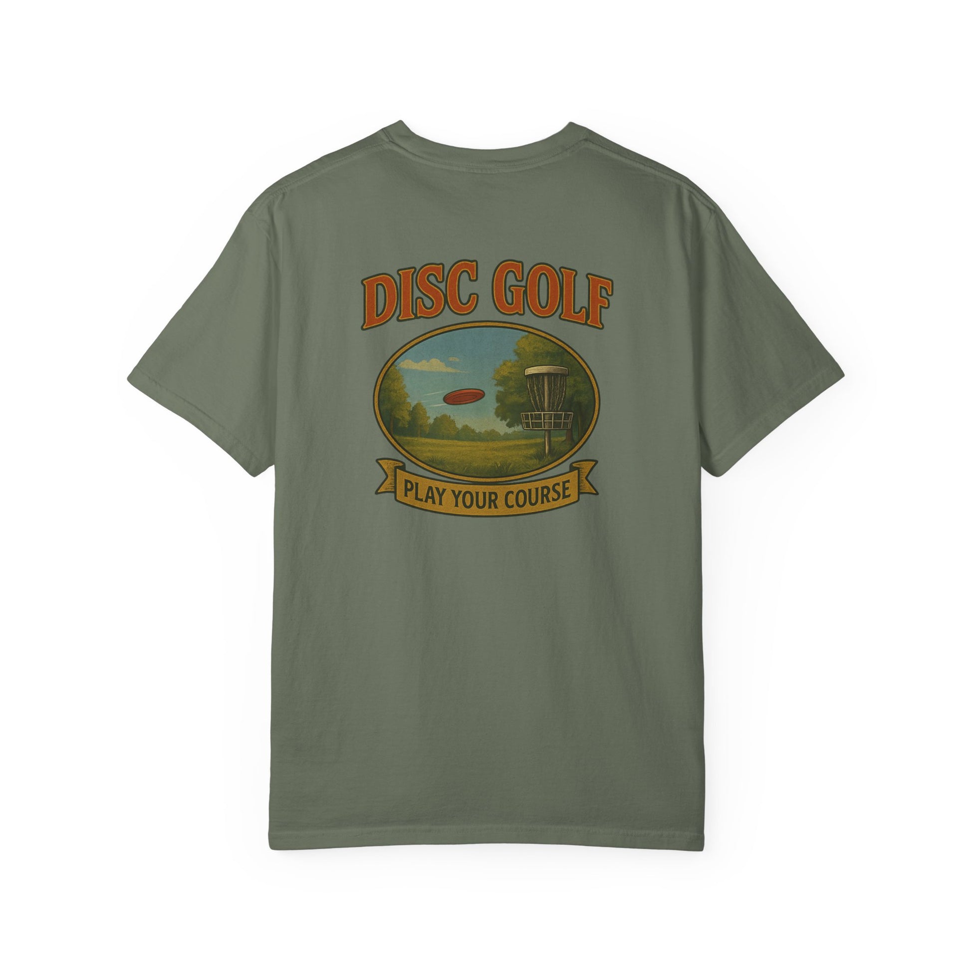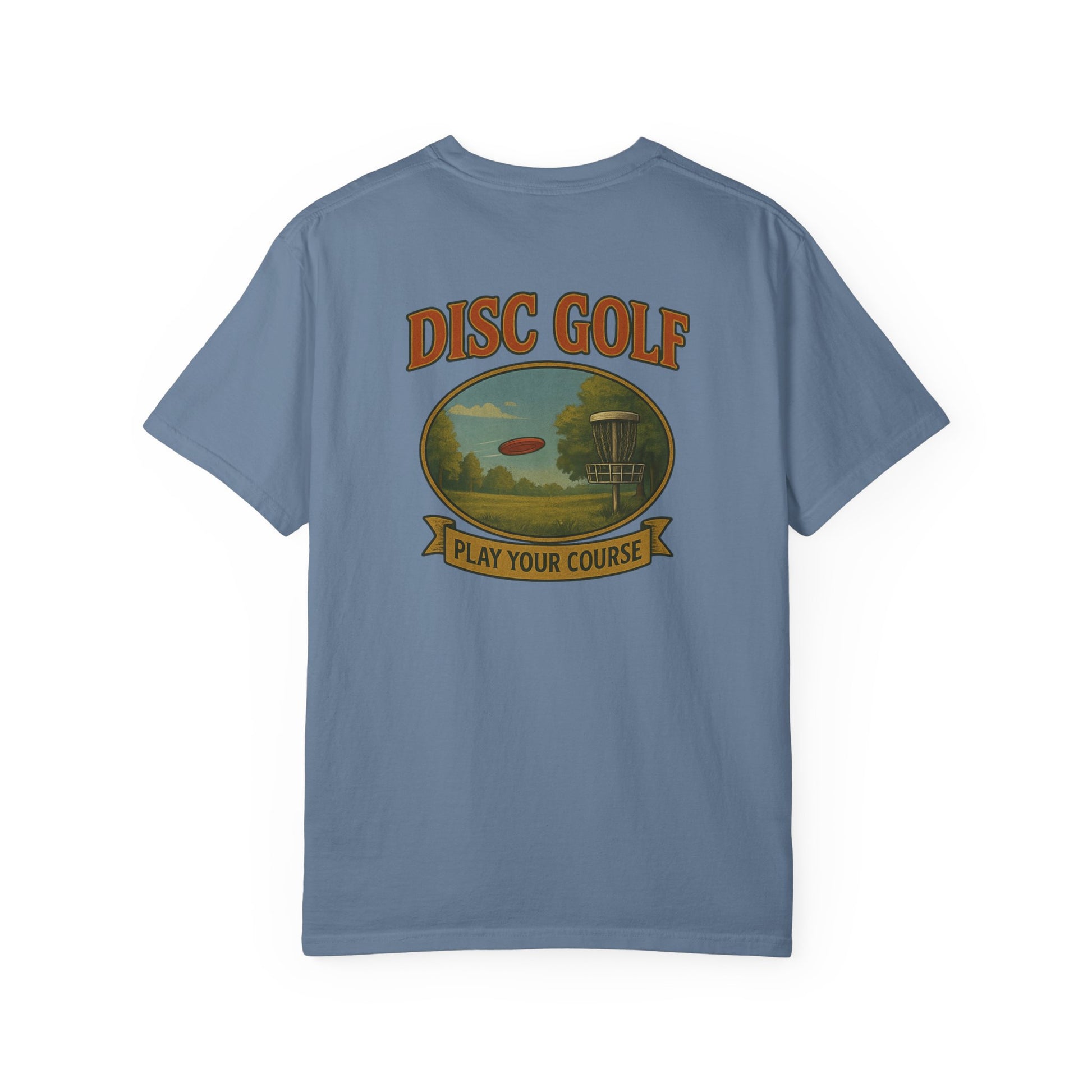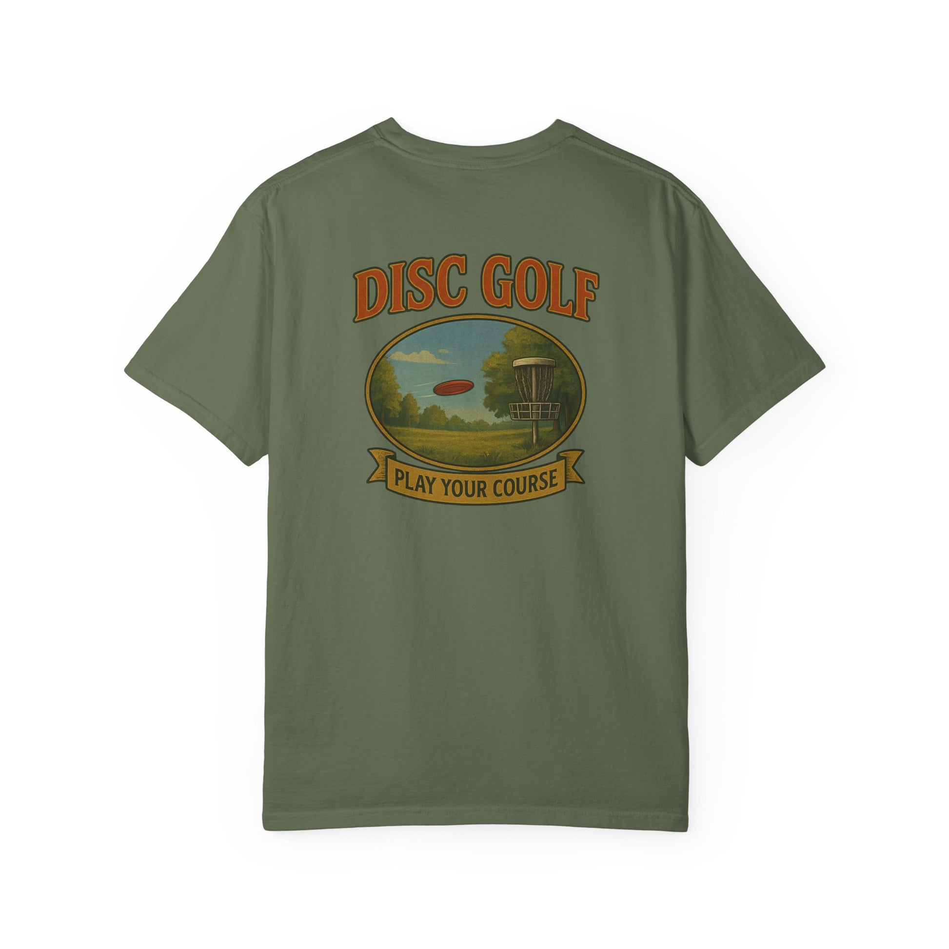 Vintage-inspired Comfort Colors Tee with a disc golf design perfect for players who love the game. This shirt offers a relaxed fit and ultra-soft feel, making it ideal for everyday wear on the course or off. Relevant for disc golf enthusiasts, great for casual wear, local tournaments, and outdoor activities.